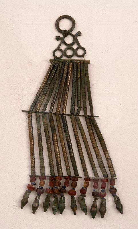 Pettorale composito costituito da un anello di sospensione e un pendente triangolare, formato da tre anelli sormontati da uno più grande con appendici laterali, di bronzo; da tre barrette in lamina bronzea di diverse dimensioni, forate, intervallate da due gruppi di dieci saltaleoni in fettuccia bronzea a più avvolgimenti; alla terza barretta sono sospese dieci serie di pendenti costituiti da due o tre vaghi di ambra e due di pasta vitrea,alternati; ciascuna termina con un pendente bronzeo a forma di secchiello.