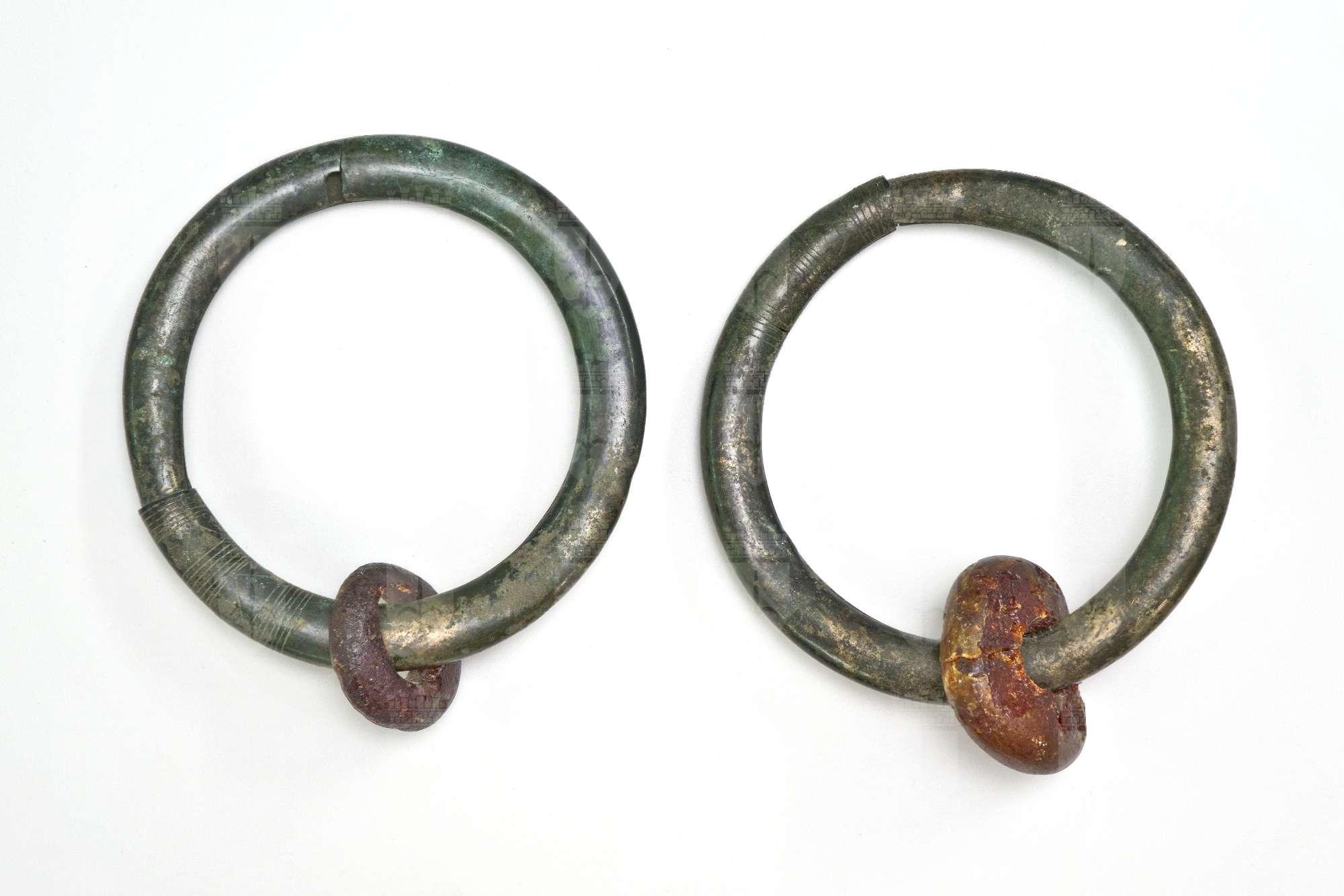 Grande armilla di sottile lamina bronzea ribattuta, a sezione ellittica, le estremità sono innestate una nell'altra; quella esterna è decorata da tre gruppi di sette linee, intervallati da un motivo a zig-zag inciso in senso verticale. E' inserito un grande disco d'ambra, di forma irregolare e di colore bruno rossastro, trasparente.