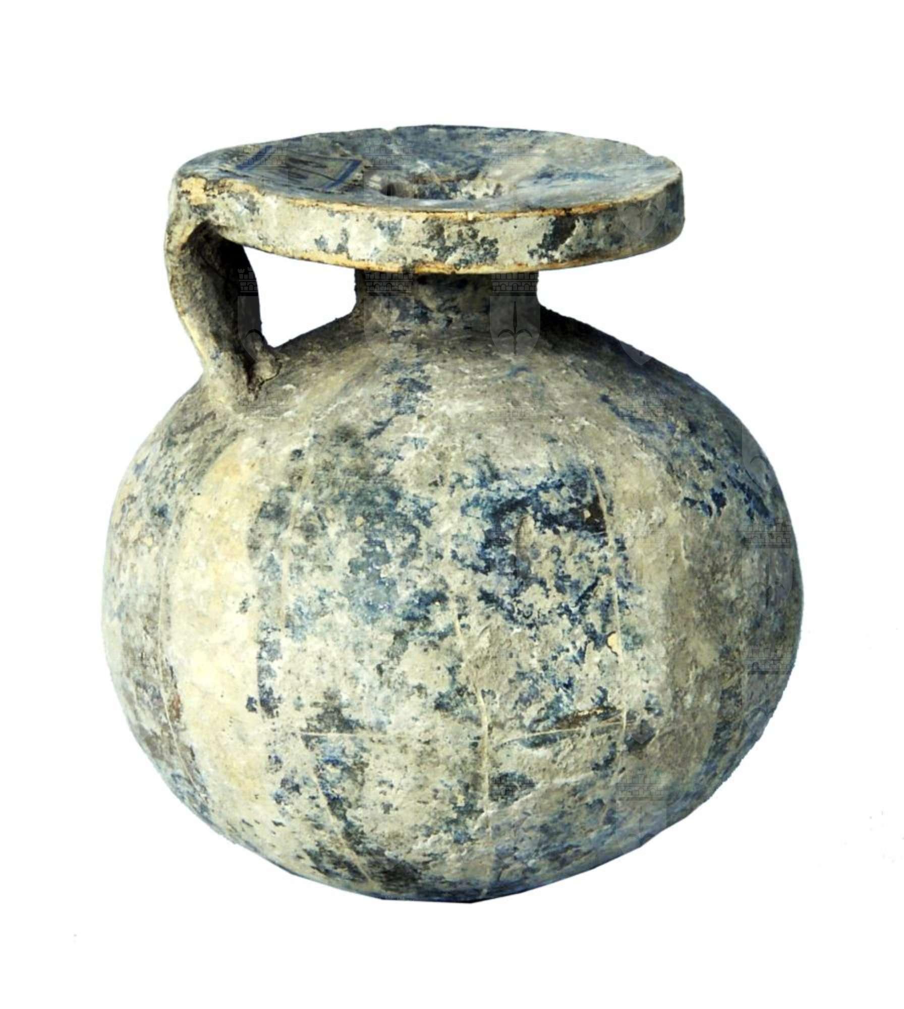 Aryballos corinzio con decorazione a spicchi bruni e bianchi più sottili.
