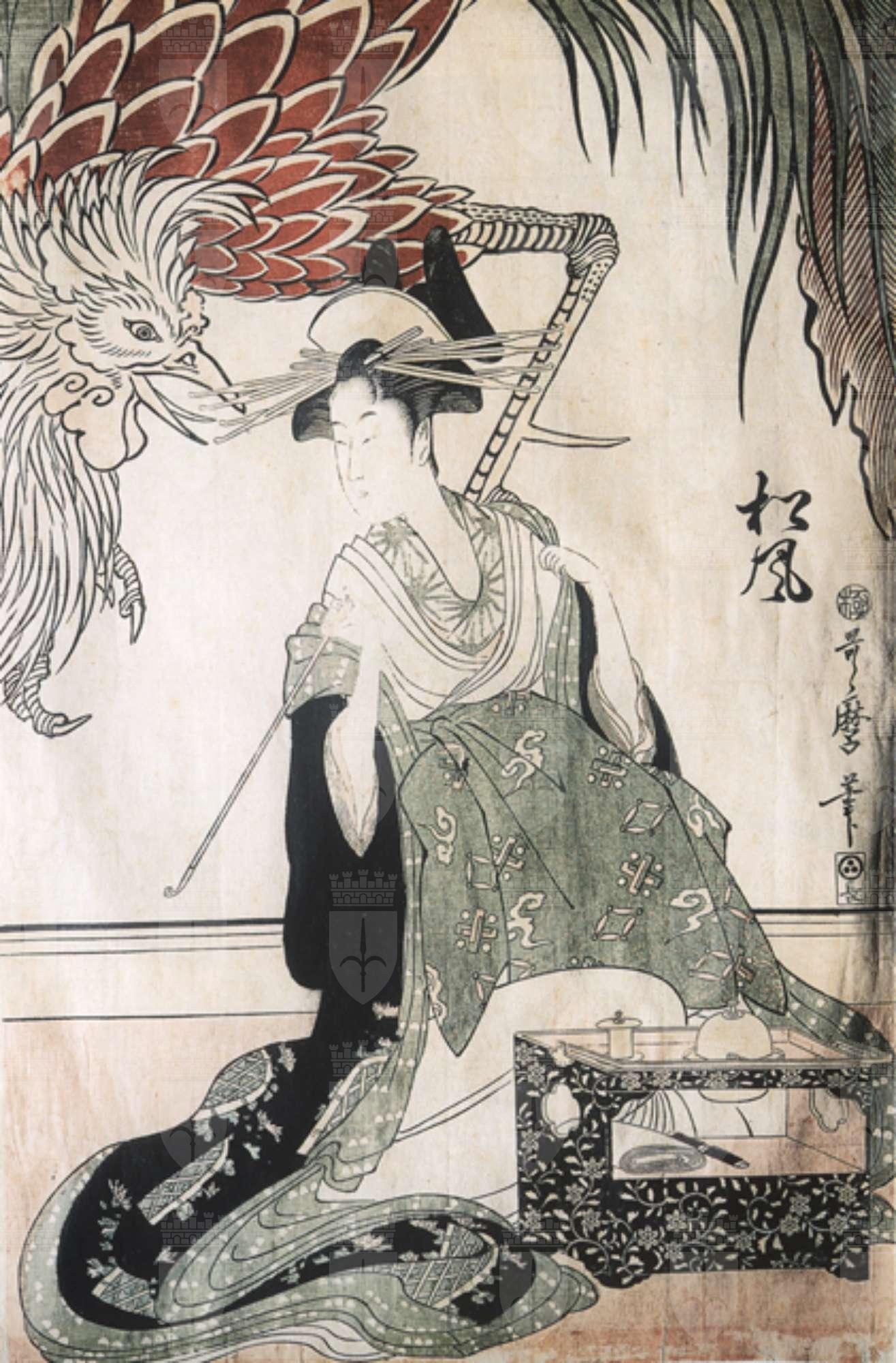 Parte centrale di un trittico O-ban che ritrae tre cortigiane della casa verde Matsubaya, nel quartiere dei piaceri di Edo, eseguite in numerose varianti. La silografia pubblicizza una famosa bellezza dell'epoca, la cortigiana Matsukaze della casa Matsubaya, ritratta in ginocchio davanti a un tavolinetto laccato con in mano la caratteristica lunga pipa. L'oiran, cortigiana di gran classe, qui raffigurata è acconciata alla moda con la pettinatura a farfalla, indossa un abito da parata, impostato sui colori del beige, del verde e del nero. L'ampio mantello nero, riversato con apparente negligenza sulle spalle, ricade a terra in morbidi ondeggiamenti a serpentina. Sulla parete di sfondo campeggia l'immagine del mitico uccello Fenhuang, di origine cinese, simile alla fenice, che conduce gli sposi nel paradiso degli Immortali.
