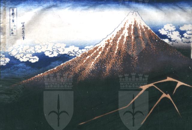 Entro il cartiglio: - titolo Sanka hakuu (Temporale sotto la cima); - titolo della raccolta Fugaku sanjurokkei (Le trentasei vedute del monte Fuji)