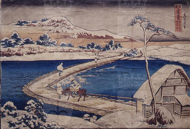 La schematizzazione delle forme tradizionali del paesaggio fa ricercare nuovi impulsi dalla grafica prospettica occidentale conosciuta, a mezzo degli olandesi, da tutto il Settecento. Il riuscito espediente prospettico del ponte a boomerang, che unisce le due rive e crea la profondità dell' inquadratura, è accentuato dallo "slontanare" delle figurine che lo attraversano e dalle due capanne all'estremità. Il paesaggio è l'elemento dominante e al suo interno si muovono le piccole figurine dei viandanti. In questa serie, i ponti si inseriscono nella natura e ne diventano una parte integrante, creando una mediazione tra la natura stessa e il mondo umano. La serie è stata pubblicata da Nishimuraya Yohachi (Eijundo), lo stesso editore delle Trentasei vedute del monte Fuji.