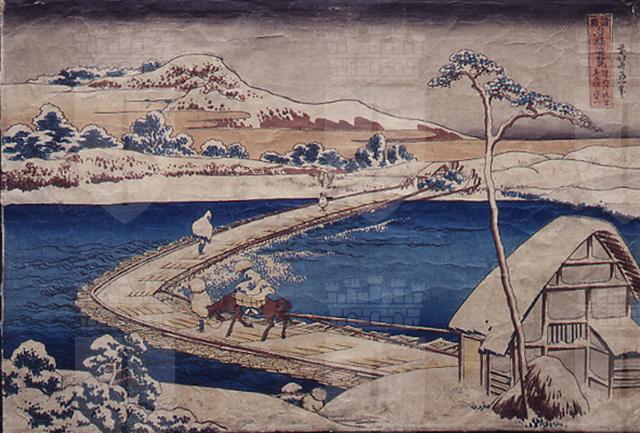 La schematizzazione delle forme tradizionali del paesaggio fa ricercare nuovi impulsi dalla grafica prospettica occidentale conosciuta, a mezzo degli olandesi, da tutto il Settecento. Il riuscito espediente prospettico del ponte a boomerang, che unisce le due rive e crea la profondità dell' inquadratura, è accentuato dallo "slontanare" delle figurine che lo attraversano e dalle due capanne all'estremità. Il paesaggio è l'elemento dominante e al suo interno si muovono le piccole figurine dei viandanti. In questa serie, i ponti si inseriscono nella natura e ne diventano una parte integrante, creando una mediazione tra la natura stessa e il mondo umano. La serie è stata pubblicata da Nishimuraya Yohachi (Eijundo), lo stesso editore delle Trentasei vedute del monte Fuji.