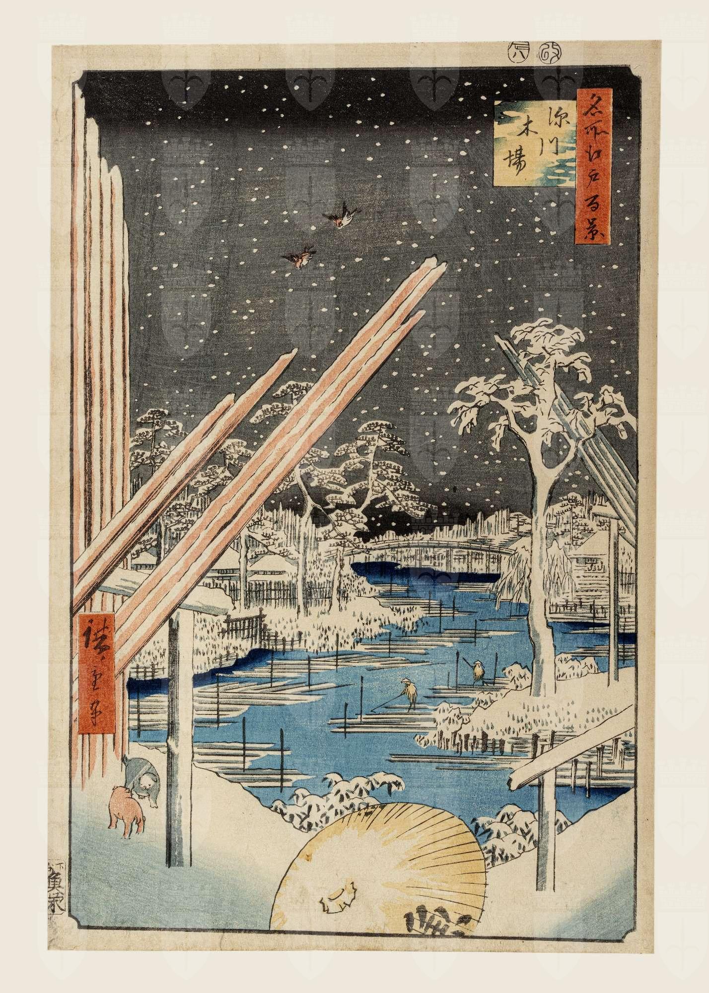La scena raffigura i depositi di legname del distretto di Fukagawa durante una nevicata. Il legname veniva raccolto in laghetti collegati da canali e veniva trasportato dai taglialegna raccolto in zattere. Nella scena si riconoscono in 2° piano due di essi, vestiti con mantelli e cappelli di paglia per proteggersi dalla neve. Sfidano il freddo due cani sulla sinistra, due passeri in volo e un ombrello in primo piano, che reca il nome dell'editore. Un esemplare della medesima stampa è presente nella collezione dell'Art Institute di Chicago, al Museum of Fine Arts di Boston e al British Museum di Londra.