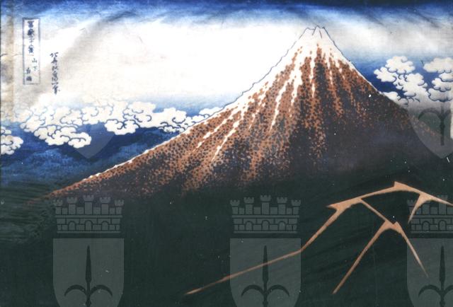 Il titolo proprio è Sanka hakuu, scritto nel cartiglio verticale sulla sinistra del foglio ed è anche reso come "Tempesta sotto la cima"