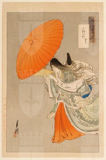 La stampa fa parte della serie: Gekko zuihitsu (La raccolta delle opere di Gekko).Ono no Komachi fu una celebre poetessa giapponese. Qui è ritratta a figura intera, con lunghissimi capelli neri sciolti, la pelle delle mani e del viso bianchissime e due puntini neri sulla fronte, al posto delle sopracciglia rade, secondo i dettami della moda del periodo Heian (794-1185) per le donne di rango. Con entrambe le mani sostiene all'altezza del viso un sensu, ventaglio pieghevole, per ripararsi dal forte vento che le fa abbassare gli occhi e la spettina. Dietro di lei, un uomo sorregge un grande ombrello arancio che fa da scudo contro il vento e richiama il colore della gonna della donna. L'intensità della pioggia è resa tramite i capelli mossi dal vento e dal gonfiarsi delle maniche dell'elegante kimono. Un altro esemplare della stampa è conservato presso il Museum of Fine Arts di Boston.