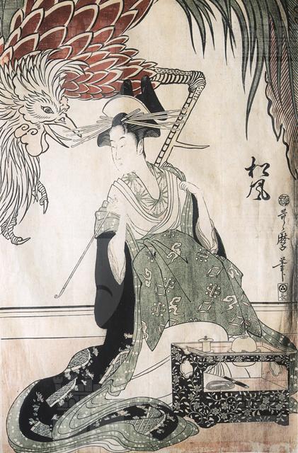 Parte centrale di un trittico O-ban che ritrae tre cortigiane della casa verde Matsubaya, nel quartiere dei piaceri di Edo, eseguite in numerose varianti. La silografia pubblicizza una famosa bellezza dell'epoca, la cortigiana Matsukaze della casa Matsubaya, ritratta in ginocchio davanti a un tavolinetto laccato con in mano la caratteristica lunga pipa. L'oiran, cortigiana di gran classe, qui raffigurata è acconciata alla moda con la pettinatura a farfalla, indossa un abito da parata, impostato sui colori del beige, del verde e del nero. L'ampio mantello nero, riversato con apparente negligenza sulle spalle, ricade a terra in morbidi ondeggiamenti a serpentina. Sulla parete di sfondo campeggia l'immagine del mitico uccello Fenhuang, di origine cinese, simile alla fenice, che conduce gli sposi nel paradiso degli Immortali.