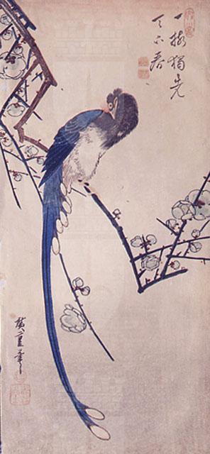 Su un ramo di pruno fiorito, usuale metafora della primavera, si evidenzia la sinuosa figura di un uccello del paradiso blu, caratterizzato dalle due lunghissime e sottili piume a canna con cui termina la coda. La composizione è tutta impostata sulla ricerca di un equilibrio tra forze in conflitto, rappresentate astrattamente sul piano dal contrapporsi delle due oblique disegnate dal ramo, che si spezza ulteriormente negli scatti zigzaganti di brevi linee secche ed aguzze, e dalla sferzata della lunga coda dell'uccello. I versi in cinese recitano: "Un primo solitario pruno fiorito, e l'intero mondo diventa primavera" (Yi mei du xian tianxia chun). Cfr. Goldman 1988, n. 16 e Ukiyoe. Il mondo fluttuante, a cura di Gian Carlo Calza, 2004, p. 191 cat. III.38. Al Museum of Fine Arts di Boston è conservato un altro esemplare dell'opera.