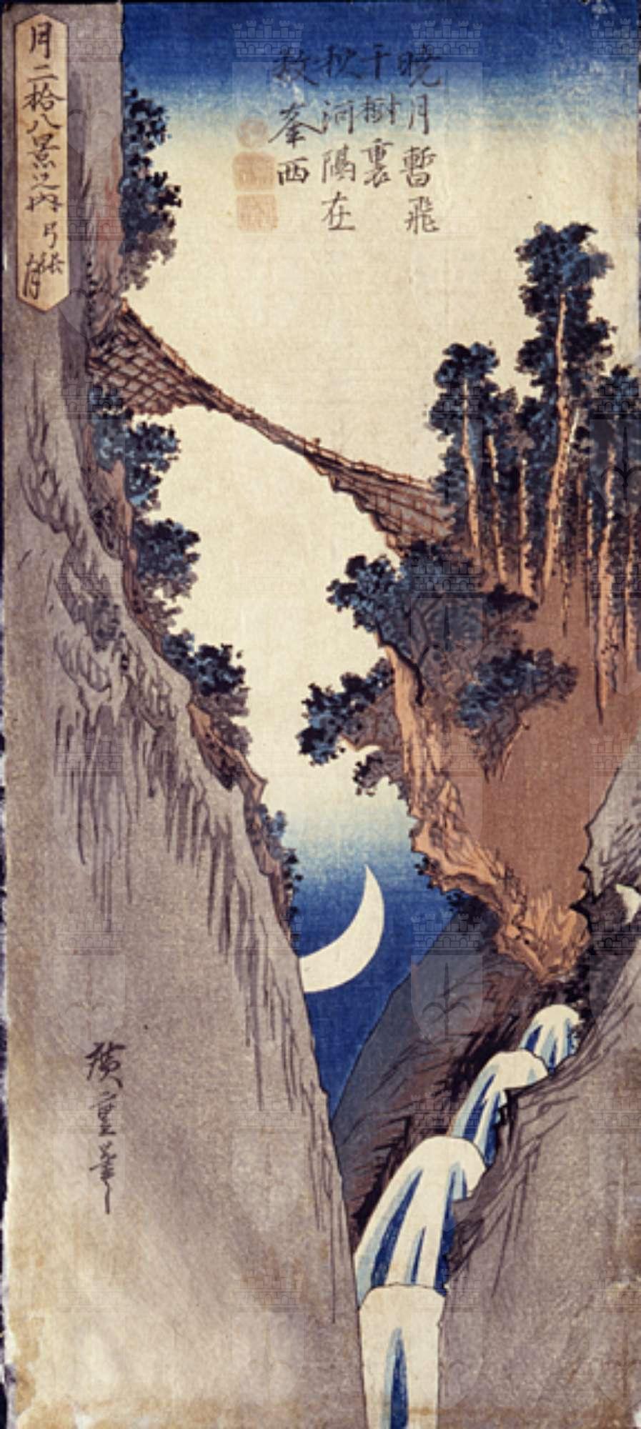 La stampa fa parte della serie incompiuta: Tsuki nijuhakkei no uchi (Serie delle ventotto vedute della luna). In questa stampa si notano alcune delle caratteristiche specifiche dello stile di Hiroshige: il dato naturale: rocce, vegetazione, cascata, è ripreso in modo da cogliere angolature particolari e, nello stesso tempo, catturare l'attenzione visiva dello spettatore. In questa silografia, l'impressione spettacolare è determinata dall'inquadratura dal basso verso l'alto che allunga e rende incombente l'immagine dei due costoni rocciosi. Il luogo ritratto è un luogo famoso: il ponte della scimmia a Enkyo, una località vicino al monte Fuji. La poesia cinese di Kanshi è dedicata a questo ponte pericolante e fragile consono all'abilità di una scimmia più che a un viaggiatore umano. Altri esemplari della stampa sono presenti nelle collezioni dell'Art Institute Chicago, Harvard Art Museum e del Museum of Fine Arts di Boston