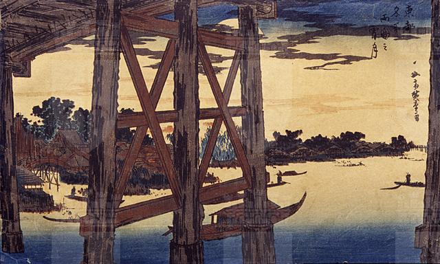 La stampa appartiene alla serie Toto meisho (Luoghi celebri della capitale orientale). In questa stampa, Hiroshige riesce a cogliere due differenti punti di vista, articolando l'immagine in un close-up fotografico ante litteram, in cui il particolare del ponte viene rappresentato in primo piano ingigantito e isolato dal resto del paesaggio. Le case, il fiume, le imbarcazioni e la vegetazione sono tutti elementi che fanno da sfondo al particolare reso in primo piano. Il corso del fiume Sumida è sbarrato dai piloni lignei del ponte e tutta la strutture focalizza lo sguardo verso il panorama di fiume, luna e quartiere urbano, affollato di alberi e di edifici, creando ulteriori angolazioni di veduta.