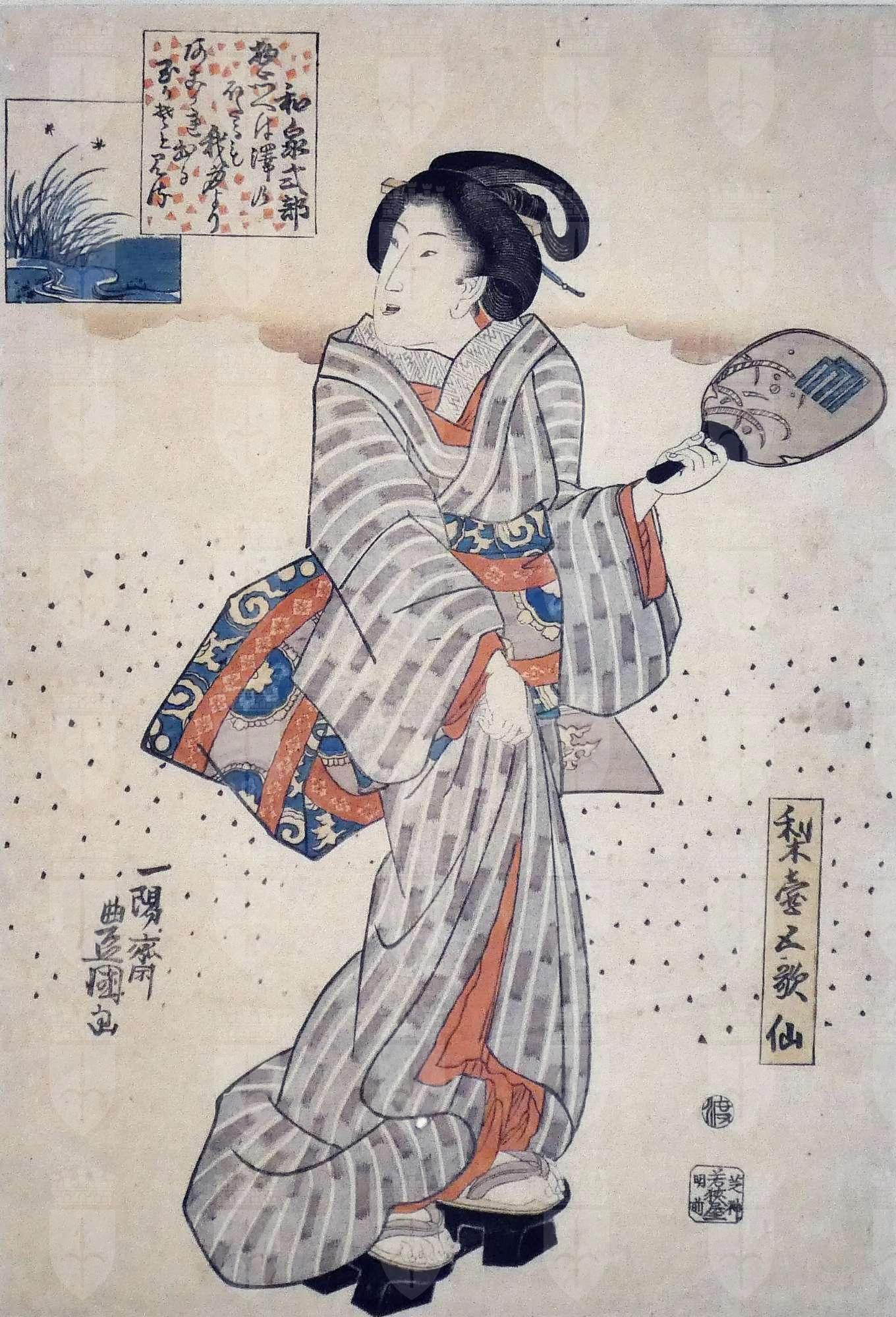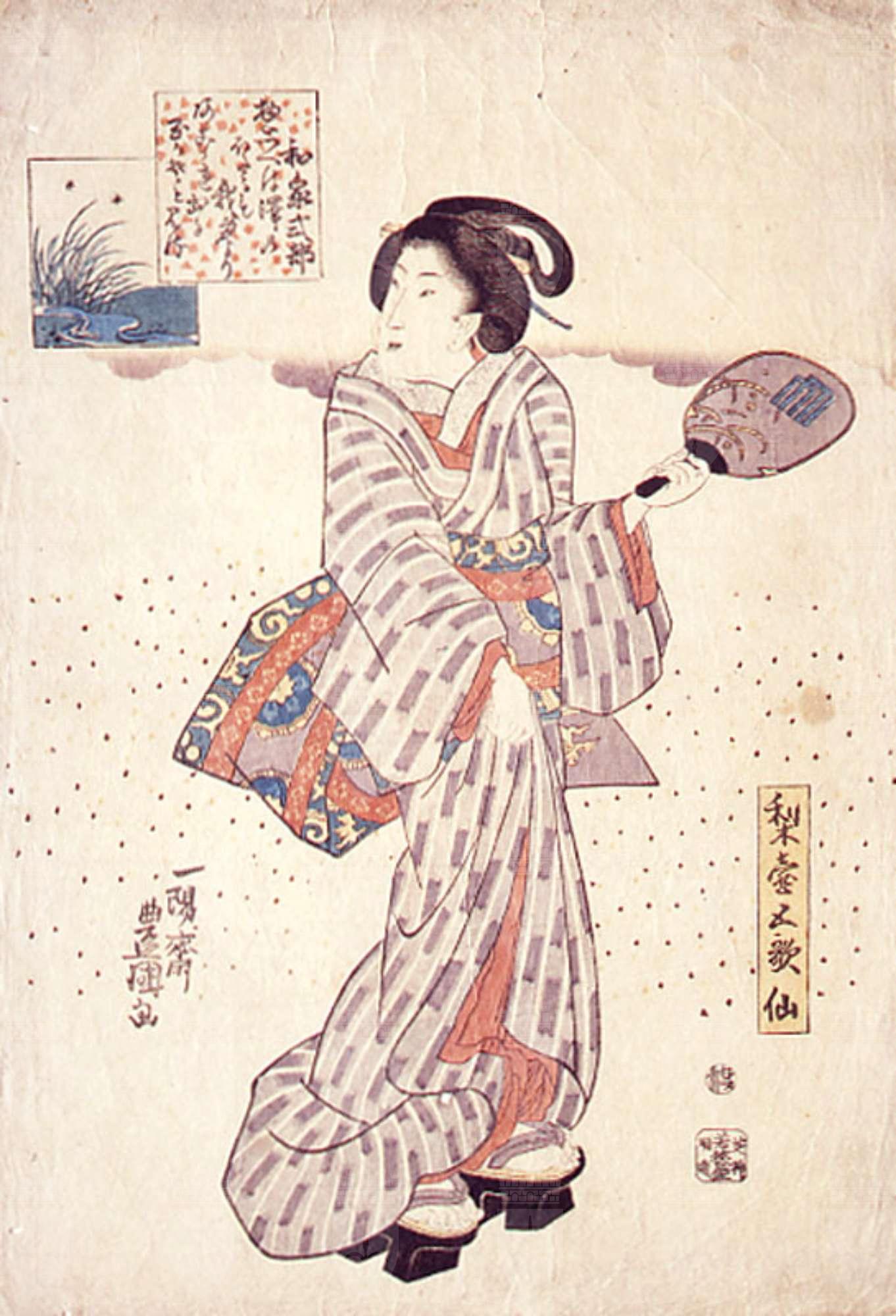 La stampa fa parte della serie Nashitsubo gokasen (I cinque poeti in onore della stanza dei peri), pensata in relazione al nuovo anno. Una donna campeggia eretta, a figura intera, al centro della stampa, lo sfondo monocromo del foglio è costellato di puntini. Indossa un kimono rigato abbastanza comune dai colori spenti ravvivato dalla fodera rossa dell'obi con inserzioni azzurre e rosso aranciato. Anche l'acconciatura è semplice, con due soli spilloni infilati tra i capelli. Cammina sugli alti geta (zoccoli) e solleva con la mano destra la parte anteriore del kimono, mentre con la sinistra espone, come se fosse una bacchetta per il volano, un ventaglio rigido e rotondeggiante (uchiwa) dipinto con un motivo di foglie sottili e una variante del mon di Genji (ovvero Minamoto). La poesia nel riquadro in alto a sinistra è tratta dalla raccolta Goshūi Wakashū, compilata nel 1086 per volere dell'imperatore Shirakawa Wakashū e contenente circa 1218 componimenti. Il waka di Izumi Shikubu presente nella stampa recita: "Quando ci penso, vedo che anche le lucciole nel ruscello sono anime che emergono dal mio corpo".